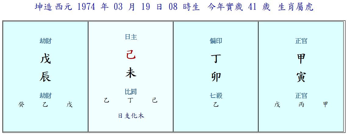 命弱屬土喜火土,七殺為本劫財為用偏印在外適合業務講師工作,地支寅卯辰三會木,卯未半三合火,頗有男人緣,36~45歲是您人生最低潮期,工作感情健康都應留意。